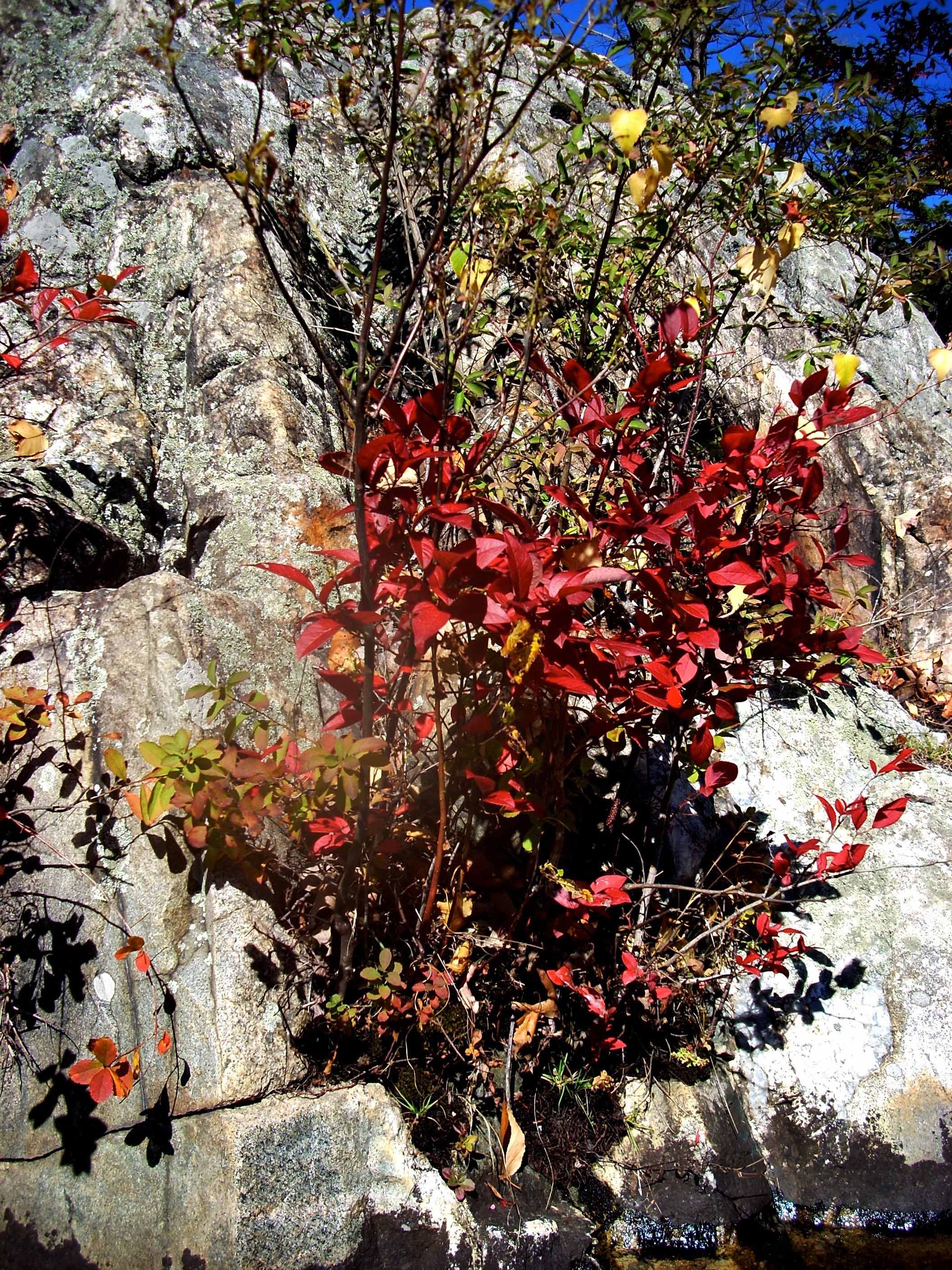 My husband had gone off to fish for a while, and I paddled slowly off to have a quiet moment, and to be "still" for a while. Something seemed to almost beckon from a small island in the middle of the lake to come closer. There were some rocks at the base of the island, where the water met the shore. There were actually small plants or bushes that were growing right out of those rocks, that were changing their colors with the season.