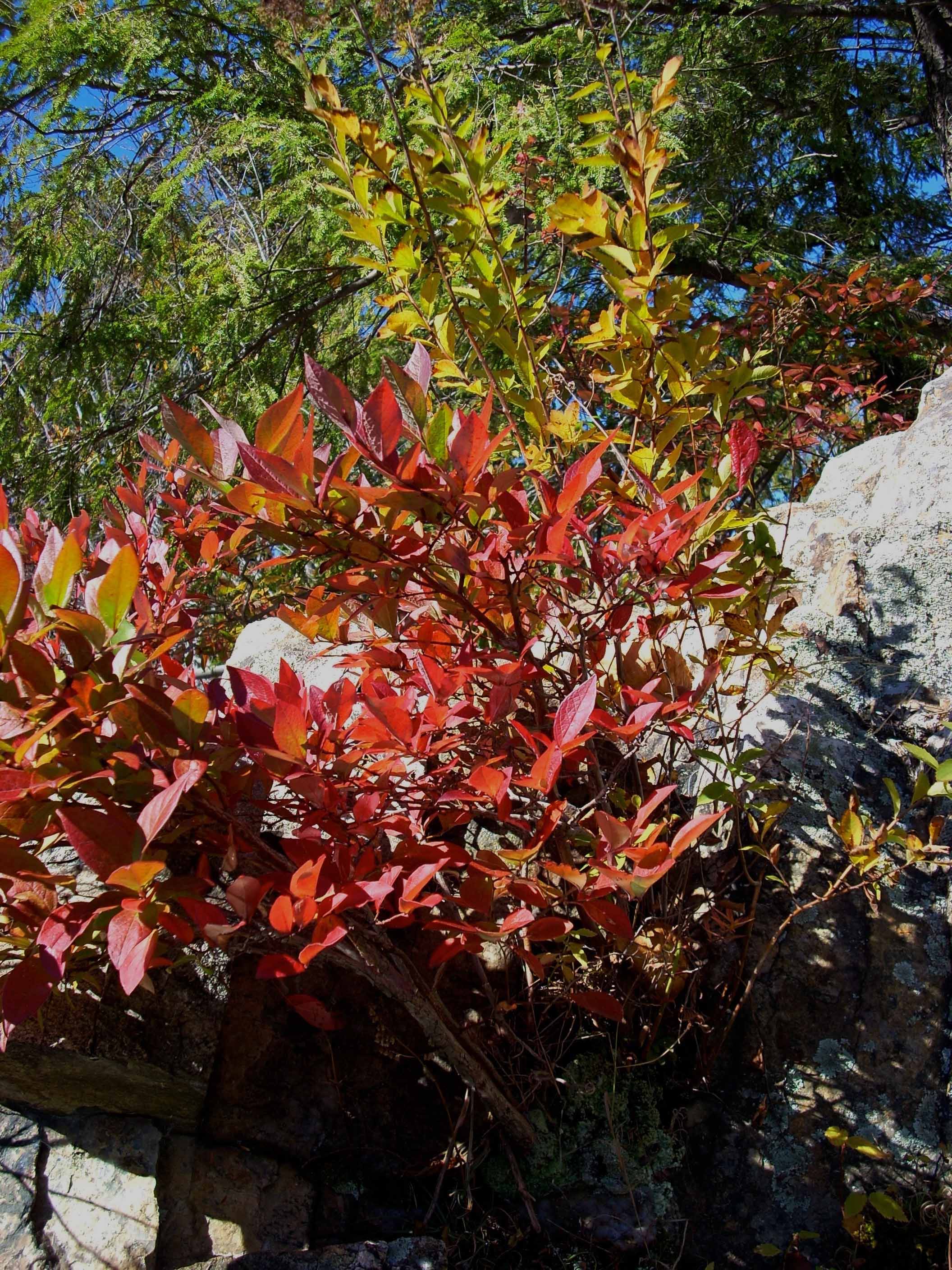 My husband had gone off to fish for a while, and I paddled slowly off to have a quiet moment, and to be "still" for a while. Something seemed to almost beckon from a small island in the middle of the lake to come closer. There were some rocks at the base of the island, where the water met the shore. There were actually small plants or bushes that were growing right out of those rocks, that were changing their colors with the season.